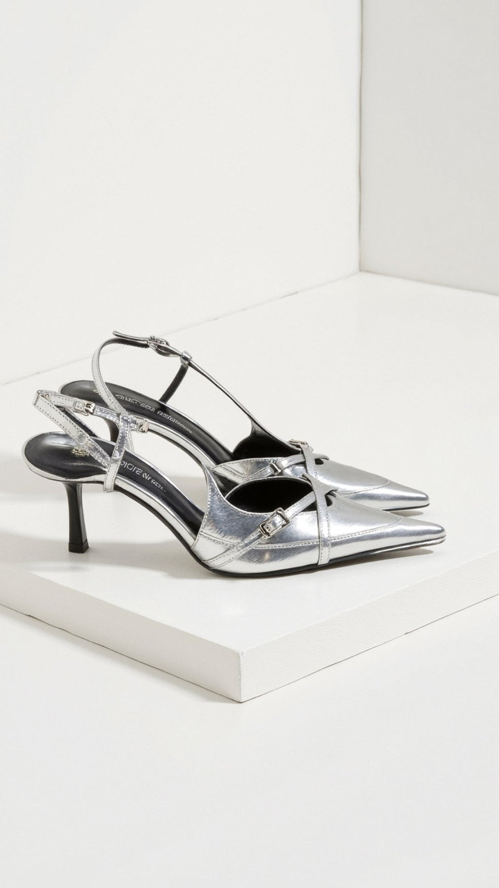 Diese Slingback Pumps verbinden eine klare moderne Linie mit einem femininen Auftritt. Die spitz zulaufende Form streckt das Bein optisch und sorgt zusammen mit dem schmalen Absatz für eine elegante Silhouette. Der offene Fersenbereich wirkt luftig leicht während die feinen Riemchen mit Schnalle den Fuß sicher umschließen und für guten Halt sorgen.