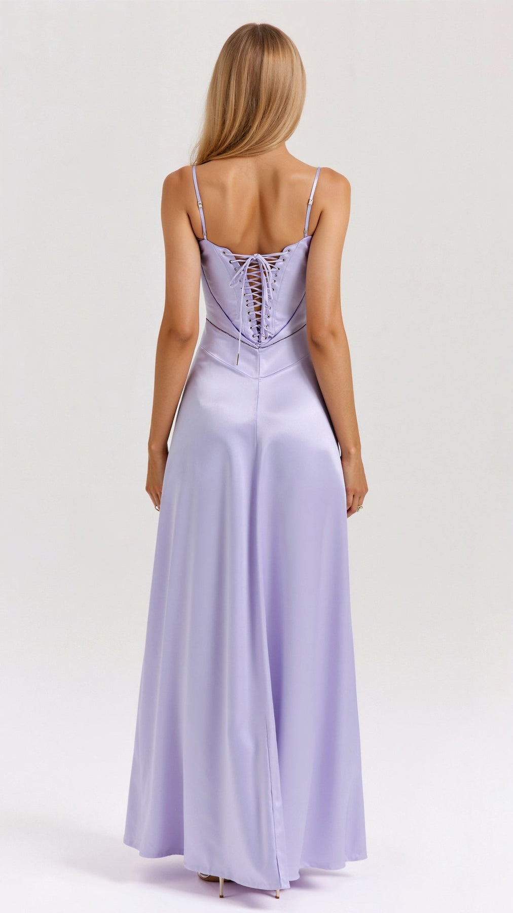 Dieses Maxikleid kombiniert eine schlanke, feminine Silhouette mit einem weich fließenden Fall. Das figurnahe Oberteil mit geradem Ausschnitt betont das Dekolleté dezent, während die feinen Träger Schultern und Hals leicht und offen wirken lassen. Die zarte Schnürung im Taillenbereich formt eine schöne Linie und unterstreicht die natürliche Figur, ohne den Look zu überladen.